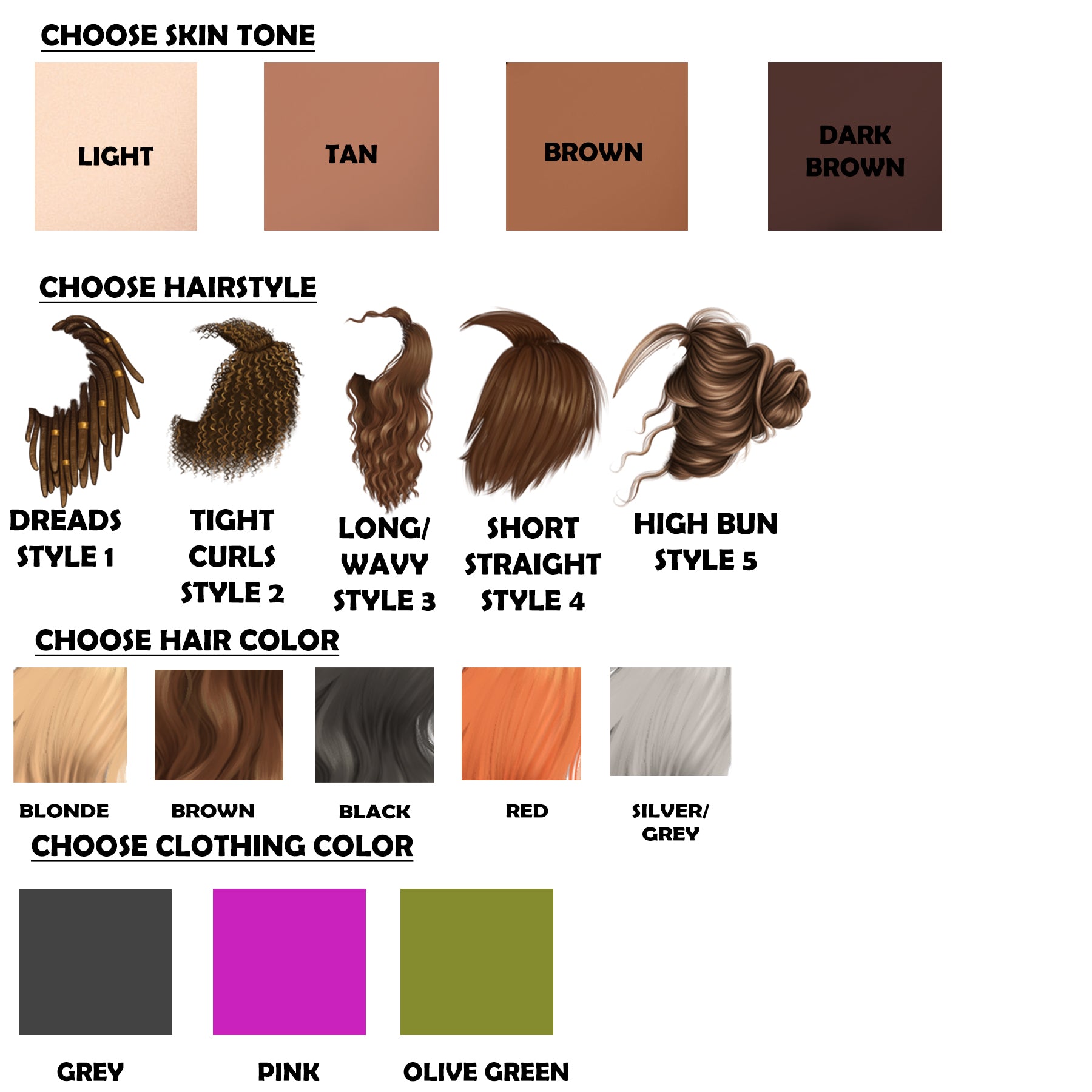 DIRECTIONS: IN THE BOX BELOW PLEASE PUT YOUR OPTIONS FOR SKIN TONE, CLOTHING COLOR AND HAIRSTYLE